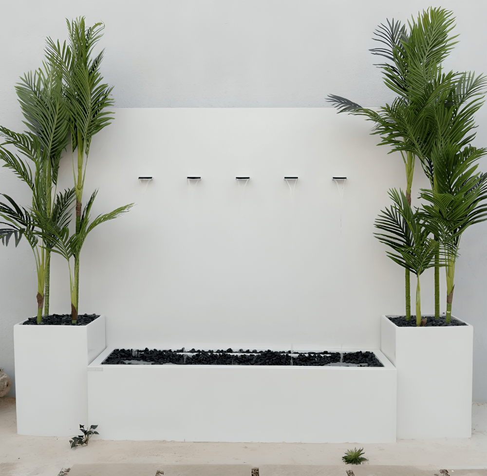 حول حديقة منزلك أو فناءك الخارجي إلى ملاذ من الهدوء والفخامة مع شلال جداري أبيض بتصميم مصبات متعددة وتنسيق نخيل صناعي أنيق.